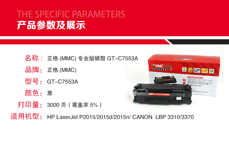 商品名称:正格(MMC)专业版黑色硒鼓GT-C7553A正格硒鼓HPLaserJetP2015/2015d/2015n